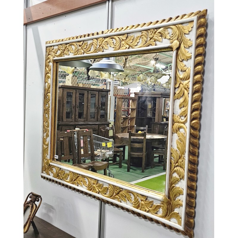 Espejo decorativo, con ornamentos florales en tonos dorados.